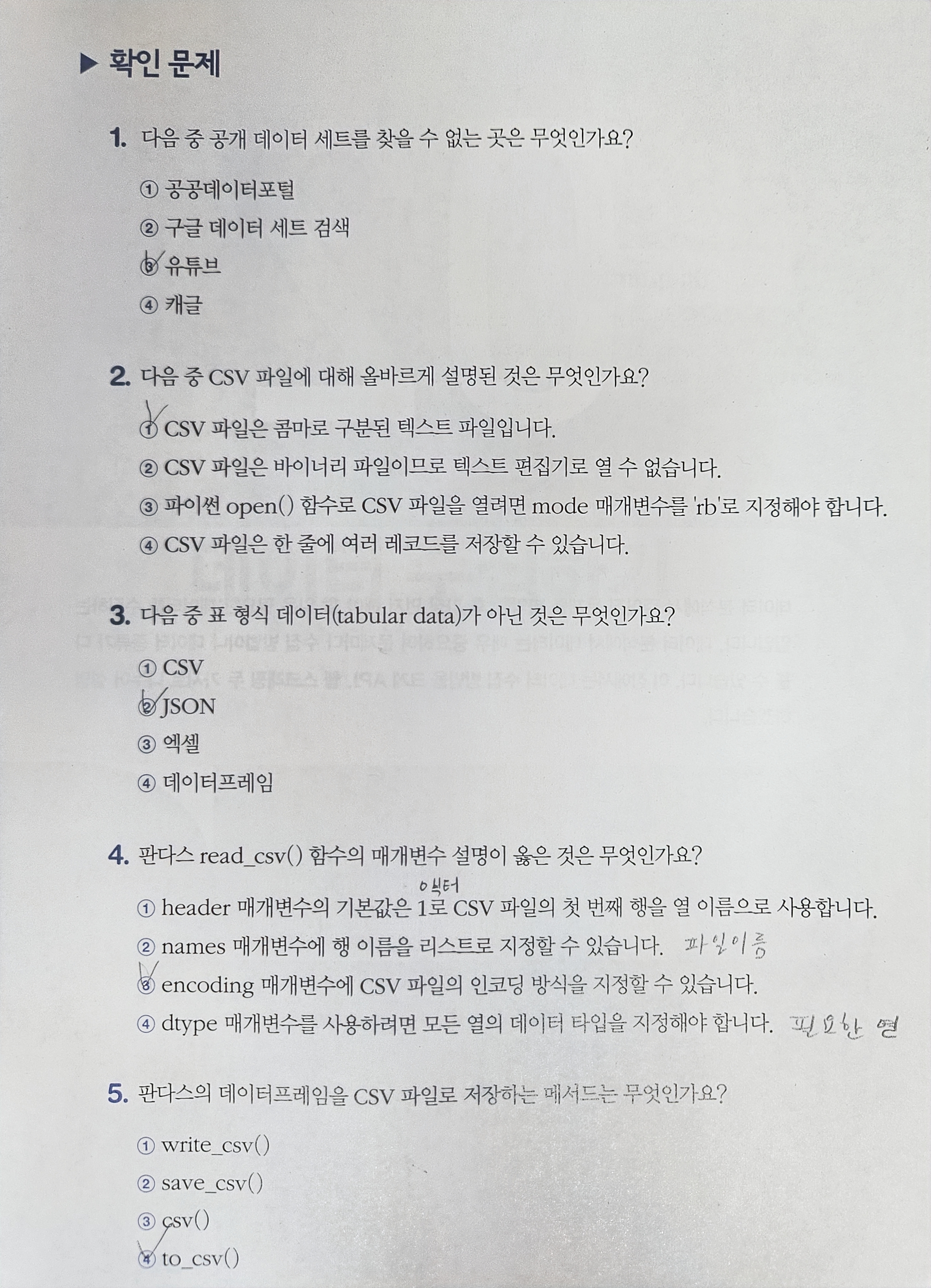 - CSV 파일의 첫 행이 열 이름이 아니라면 read_csv() 함수를 호출할 때 header 매개변수를 None으로 지정해서 데이터 첫 행에 열 이름이 없다는 것을 알리고, names 매개변수에 열 이름 리스트를 따로 전달해줌