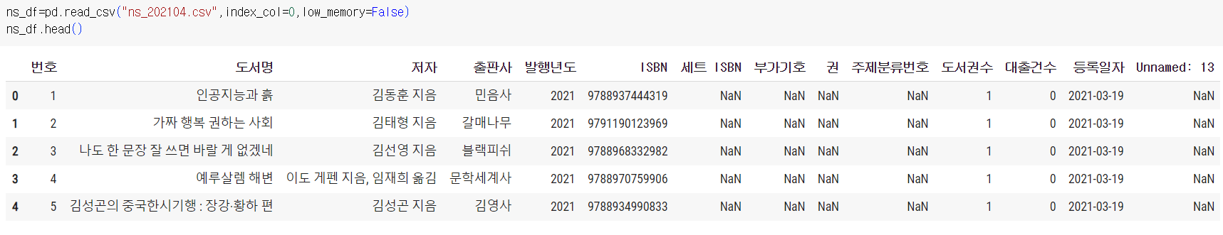 -> 판다스는 CSV 파일을 읽을 때 '도서명'과 '대출건수' 같은 열에 어떤 종류의 데이터가 저장되어 있는지 자동으로 파악한다. 이때 메모리를 효율적으로 사용하기 위해 CSV 파일을 조금씩 나누어 읽는다. 이때 파악한 데이터 타입이 달라지면 경고가 발생한다. 이 파일에서는 5,6,9 열 때문에 오류가 발생했다.